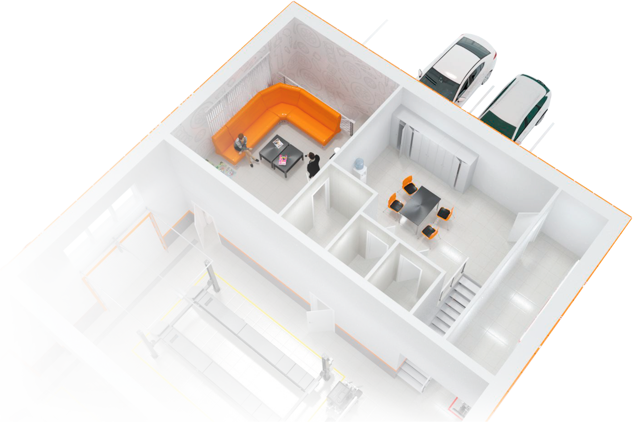 | | 2 этажа 1 этаж: 310 м2 цех и 78 м2 приёмка, склад, кабинет. 2 этаж: 78 м2 раздевалка для сотрудников, клиентская зона |